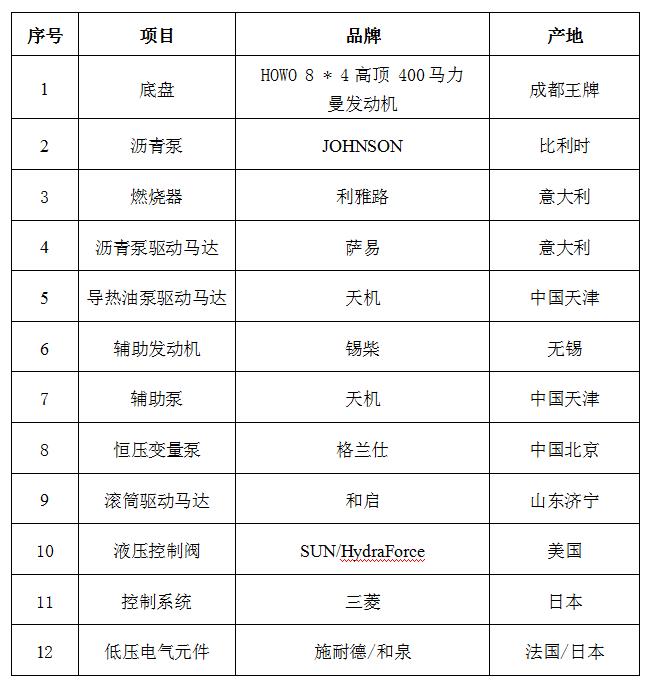 14.整機(jī)關(guān)鍵部分的零部件(如液壓泵、瀝青泵、導(dǎo)熱油泵、液壓馬達(dá)等)均采用進(jìn)口元件,確保整機(jī)的可靠性,提高使用壽命;